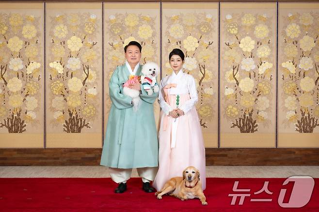 이번 한가위 영상은 지난 8일 대통령실 2층 자유홀에서 1시간에 걸쳐 촬영됐다. 사진은 한복을 입은 윤석열 대통령과 김건희 여사가 반려견 '새롬이', '써니'와 함께 촬영하는 모습. (대통령실 제공) 2024.9.13/뉴스1