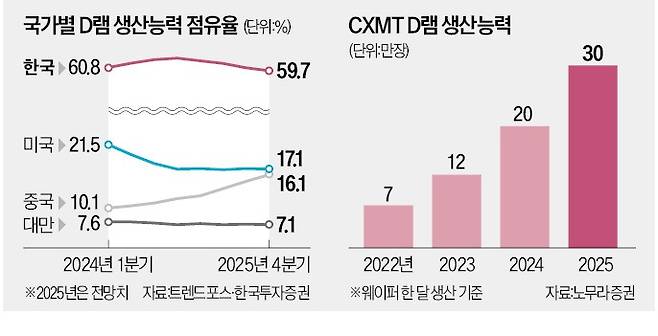 캐파 확장은 현재진행형이다. 13일 노무라증권 최신 보고서에 따르면 CXMT의 D램 생산능력은 올해 말 20만 장으로 증가하고, 내년에는 30만 장으로 늘어난다. 전 세계 생산량의 15%를 CXMT가 차지한다는 얘기다. 생산능력만 놓고 보면 3위 마이크론(약 20%)을 거의 따라붙는 규모가 된다. 삼성전자와 SK하이닉스의 D램 생산능력은 각각 40%와 30% 안팎이다.