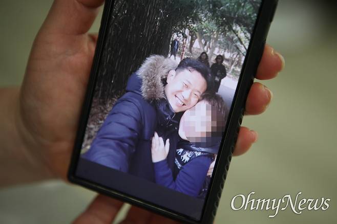 | ▲ 지난 8월 18일 새벽 2시 10분께, 쿠팡CLS 시흥2캠프에서 남편 고 김명규(48)씨와 함께 일용직으로 일하다 눈 앞에서 남편을 잃은 우다경(52)씨가 남편의 생전 사진을 보여주고 있다. 과거 아들과 함께 찍은 모습. |