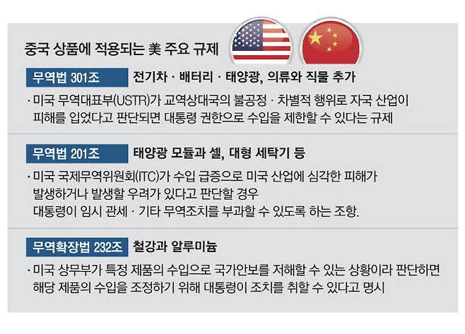 무역법 201조에 따른 수입제한 품목은 태양광 모듈과 셀, 대형 세탁기 등이고, 무역확장법 232조는 철강과 알루미늄에 관세를 부과하는 근거가 된다. 두 조항의 대상 품목 중 개인이 수입할 만한 제품이 많지 않다는 점을 감안하면, 중국을 겨냥한 이번 조치의 핵심은 무역법 301조다. 이 조항은 미국 무역대표부(USTR)가 교역 상대국의 불공정·차별적 행위로 자국 산업이 피해를 입었다고 판단되면 대통령 권한으로 수입을 제한할 수 있도록 하는 내용을 담고 있다.
