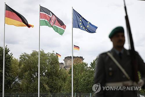 epa11601790 The flags of (L-R) Germany, Kenya and the European Union wave prior to the arrival of Kenyan President William Ruto (not pictured) at the chancellery in Berlin, Germany, 13 September 2024. President Ruto is in Berlin for talks with Chancellor Scholz focusing on bilateral issues, such as migration policy or cooperation in the field of climate and development policy, according to the German Government Press and Information Office. EPA/CLEMENS BILAN