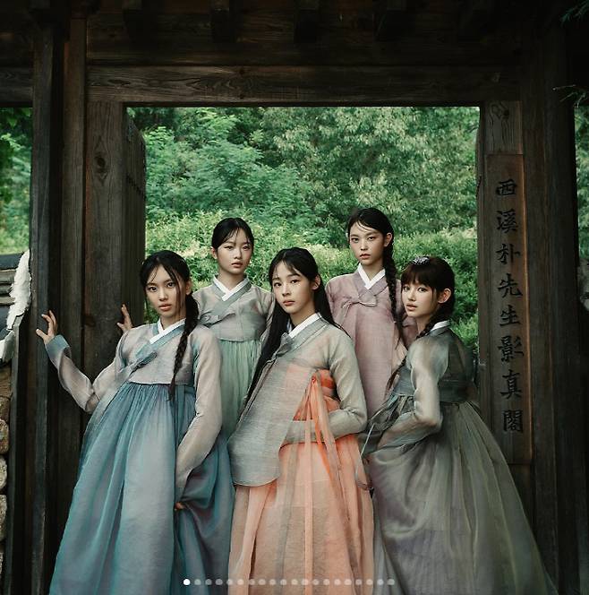 걸그룹 뉴진스가 모기업 하이브를 향한 최후 통첩 같은 긴급 라이브 방송을 끝내고 본업에 복귀한 듯 추석 한복 화보를 공개했다.