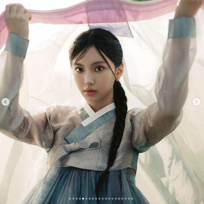 13일 뉴진스 공식 계정에는 "뉴진스와 함께 행복한 추석 보내세요"라는 글과 함께 아름다운 한옥과 어우러지는 우아한 한복을 소화해 눈길을 끌었다.