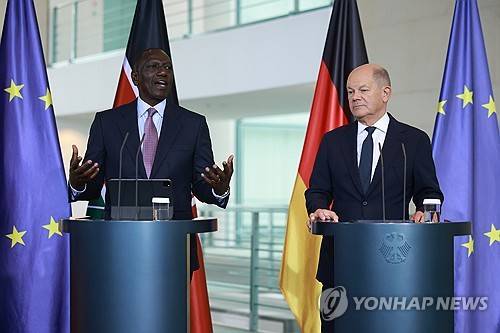 epa11602023 Kenyan President William Ruto (L) gestures next to German Chancellor Olaf Scholz (R), during a press conference at the Chancellery in Berlin, Germany, 13 September 2024. President Ruto is in Berlin for talks with Chancellor Scholz focusing on bilateral issues, such as migration policy or cooperation in the field of climate and development policy, according to the German Government Press and Information Office. EPA/CLEMENS BILAN