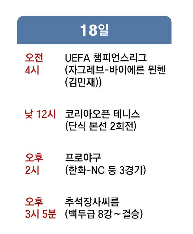 16일부터는 서울 올림픽공원 테니스코트에서 여자프로테니스(WTA) 코리아오픈 단복식 본선 1회전이 열린다. US오픈 우승자 라두카누 등이 출전한다. 지난해 이 대회 정상에 오른 뒤 자신을 ‘하프 코리안’이라고 소개했던 제시카 페굴라(미국·3위)는 출전자 명단에 이름을 올렸다가 갈비뼈 부상으로 기권했다. 페굴라의 어머니는 한국에서 태어났고 보육원에서 지내다 미국으로 입양됐다. 프로야구에선 KIA의 정규리그 1위가 연휴 기간 확정될 수도 있다. 13일 현재 KIA의 정규리그 1위 매직넘버는 5다. 프로축구 K리그1(1부 리그) 4경기, K리그2(2부 리그) 6경기가 연휴 기간 열린다.