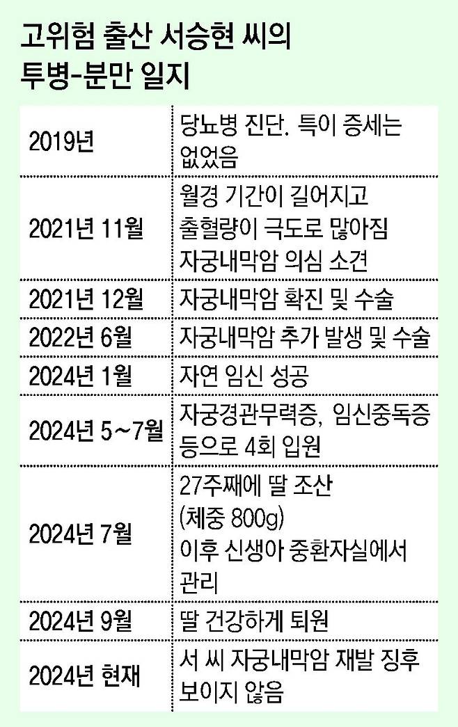 서 씨 부부는 아기를 원했다. 자궁을 절제하지 않고 보존한 것도 그런 이유에서였다. 1년의 치료를 견뎌내니 비로소 임신과 출산이 가능해졌다. 하지만 당장 아기가 들어서지는 않았다. 서 씨 부부는 시험관 아기 시술을 받을까도 생각했다. 이런 고민을 하던 중에 2024년 1월 자연 임신이 됐다. 세상이 그렇게 밝아 보일 수가 없었다. 이때부터 서 씨는 오 교수의 진료를 받게 됐다.