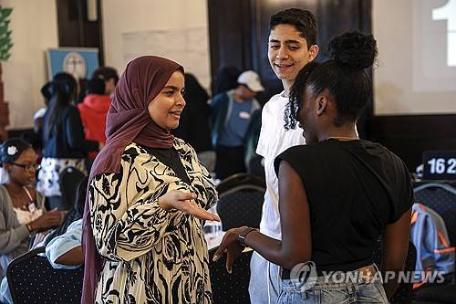 Heba Elkouraichi, left, Michael Nisimov, middle, and Chris-Ann Barnett, right, confer at YVote's Democracy Camp in New York on July 1, 2024. Elkouraichi, 16, says young people do care about democracy. "But in reality, we just don't feel included." (Emily Richardson/News21 via AP) AP PROVIDES ACCESS TO THIS THIRD PARTY PHOTO SOLELY TO ILLUSTRATE NEWS REPORTING OR COMMENTARY ON FACTS DEPICTED IN IMAGE; MUST BE USED WITHIN 14 DAYS FROM TRANSMISSION; NO ARCHIVING; NO LICENSING; MANDATORY CREDIT