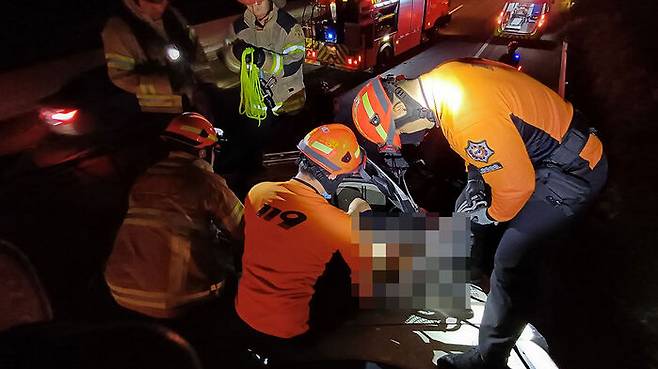 ▲ 충남 당진소방서 119 대원들이 넘어진 화물차에서 운전자를 구조하고 있다.