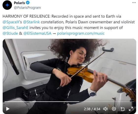 이 영상에는 현재 우주 비행 임무를 수행 중인 폴라리스 던 팀원 세라 길리스가 우주선 내에서 살짝 떠 있는 상태로 바이올린을 연주하는 모습이 담겼습니다.