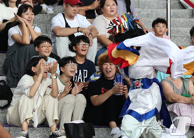 (서울=뉴스1) 장수영 기자 = 추석 연휴 첫날인 14일 오후 서울 용산구 국립중앙박물관에서 열린 '위대한 유산 , 오늘과 만나다' 행사를 찾은 가족단위 시민들이 봉산탈춤을 관람하고 있다. 2024.9.14/뉴스1