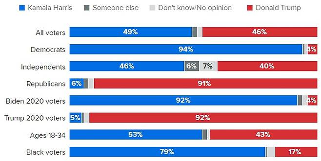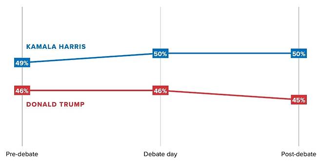 TV 토론에 자신감을 드러냈던 트럼프가 해리스를 따돌리지는 못했다. 이 조사는 미국의 등록 유권자 1405명을 대상으로 한 결과로 오차범위 내에서 격돌하는 결과이기 때문에 5%포인트 격차를 우위로 판정할 수는 없다.