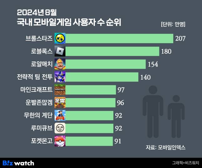 이어 '로블록스'(180만명), '로얄매치'(154만명), '전략적 팀 전투'(140만명), '마인크래프트'(97만명), '운빨존많겜'(96만명), '무한의 계단'(92만명), '류미큐브'(92만명), '포켓몬고'(91만명), '피망 뉴맞고'(81만명) 등의 순으로 나타났다. 대부분 초등학생들이 즐기는 게임으로 유명한 작품들이다.