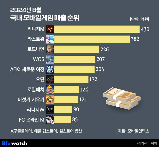 지난달 모바일 게임 매출 1위는 엔씨소프트의 '리니지M'이었기 때문이다. 이어 라스트워, 로드나인, WOS(화이트아웃서바이벌), AFK: 새로운 여정, 오딘, 로얄 매치, 버섯커 키우기, 리니지W 순으로 나타났다.