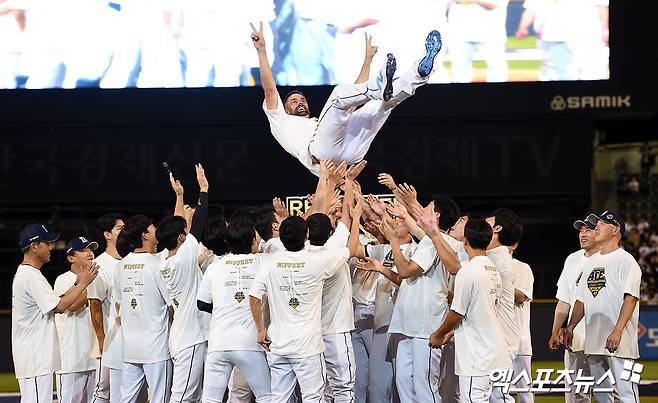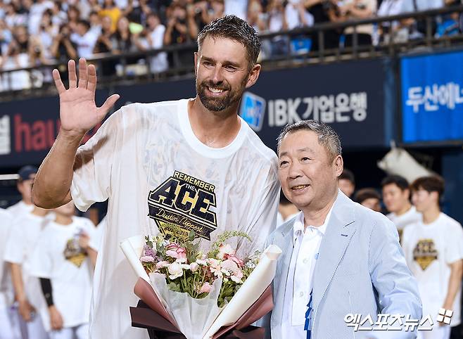 박정원 회장은 직접 그라운드로 내려가 니퍼트에게 축하의 꽃다발을 건넸다. 베어스에 두 번의 한국시리즈 우승과 수없이 많은 기쁨을 안겨줬던 에이스에게 고마운 마음을 전했다.