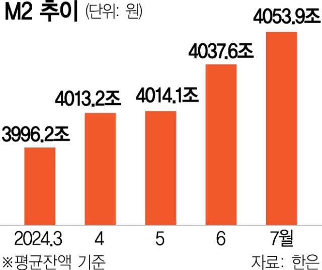 한국은행이 13일 발표한 '7월 통화 및 유동성' 자료에 따르면 7월 광의통화(M2)는 평균 잔액 기준으로 전월 대비 16조 3000억 원(0.4%) 증가한 4053조 9000억 원을 기록했다.