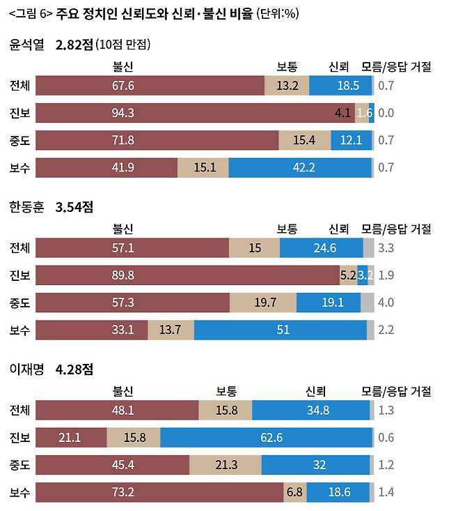 당대표 취임 한 달여가 지난 현재, 윤석열 대통령 신뢰도(2.82점)보다 한동훈 국민의힘 대표 신뢰도(3.54점)가 0.72점 더 높다. ‘당·정 갈등’에서 국민들은 한동훈 대표의 손을 들어주고 있다는 해석이 가능하다. 다만 이재명 더불어민주당 대표 신뢰도가 4.28점으로 한동훈 대표보다 0.74점 더 높다(〈그림 6〉 참조). 세 정치인 모두 불신 구간에 있지만 차이가 뚜렷하다. 한편 한동훈 대표 신뢰도는 소속 정당인 국민의힘(3.24점)보다 0.3점 높다. 반면 이재명 대표 신뢰도는 더불어민주당(4.45점)보다 0.17점 낮다.