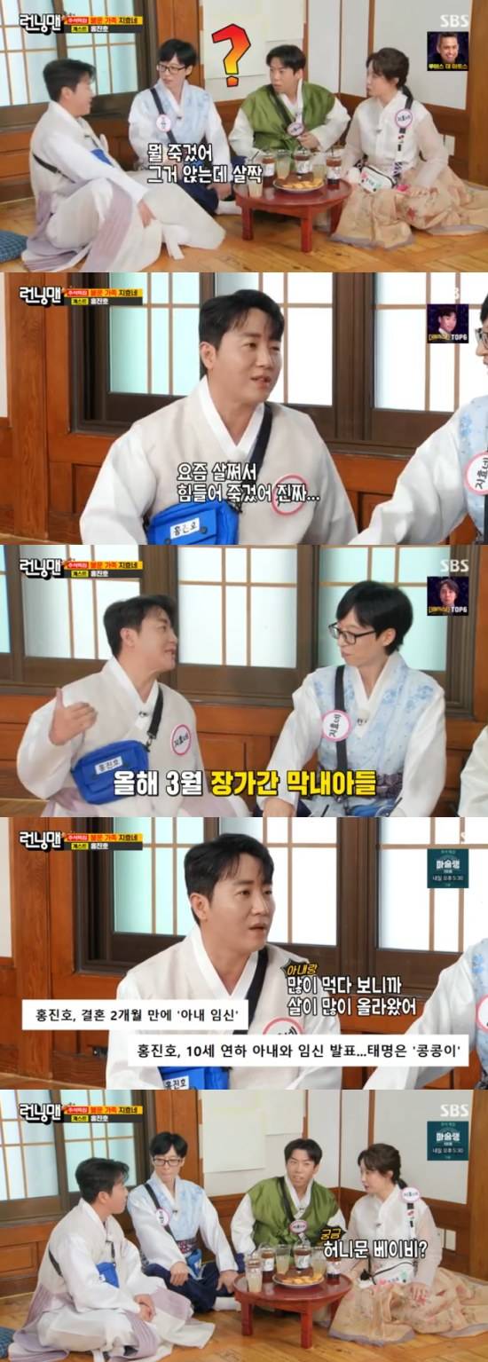 올해 3월에 결혼한 홍진호는 "신혼 아니냐. 그리고 아내가 임신을 했다. 그래서 집에만 있다 보니까 같이 많이 먹는다. 그래서 살이 많이 올랐다"고 설명하면서 허니문 베이비라고도 덧붙였다.