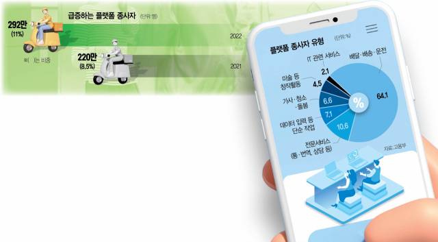 문제는 특고와 플랫폼 종사가 규모가 고용시장에서 점점 늘고 있는데, 이들을 보호할 입법 공백이 있다는 점이다. 특고는 작년 8월 기준 55만명으로 추산된다. 넒은 의미의 플랫폼 종사자는 2022년 292만 명에 이른다. 2년 만에 100만명 넘게 늘었다.
