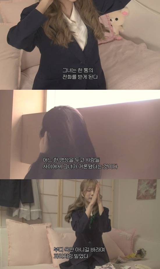 짜잔씨는 "그녀는 한 통의 전화를 받게 된다. 내용인 즉슨 어느 한 영상을 두고 사람들 사이에서 그녀가 거론됐다는 것"이라며 "그녀는 황급히 전화를 끊고 부디 욕만 아니길 바라며 파리처럼 빌었다"고 이야기했다.