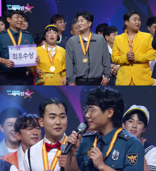 송필근은 15일 자신의 SNS에 "추석 '전국노래자랑' 연예인특집 별의 전쟁. 개콘 대표로 후배들과 출전하여 인기상 타려다가 힘 조절 실패로 1등을 하고 말았습니다. 사과드립니다"라는 메시지를 재치있게 올렸다.