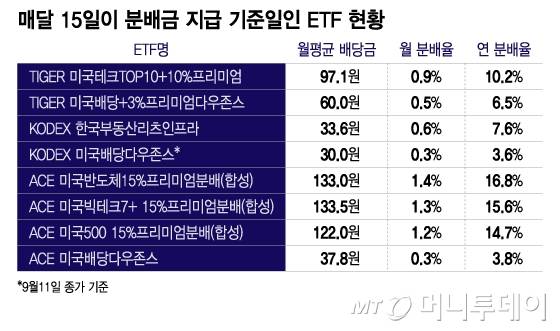 이밖에 매월 15일이 지급 기준일인 ETF로는 △TIGER 미국테크TOP10+10%프리미엄 △KODEX 한국부동산리츠인프라 △ACE 미국빅테크7+ 15%프리미엄분배(합성) △ACE 미국500 15%프리미엄분배(합성) △ACE 미국반도체15%프리미엄분배(합성) 등이 있다.