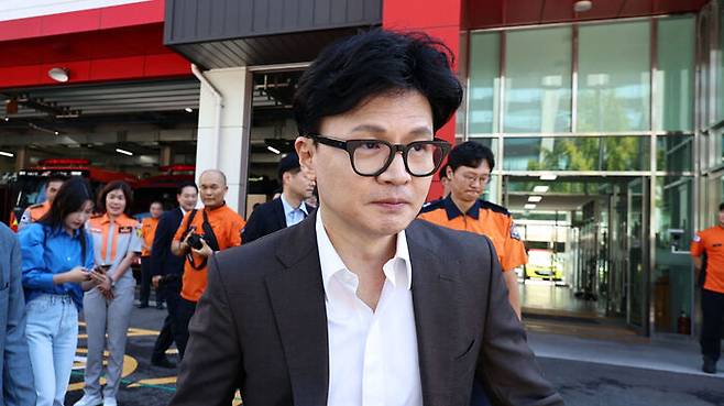 ▲ 국민의힘 한동훈 대표가 추석을 하루 앞둔 16일 오후 서울 종로소방서를 찾아 대원들을 격려한 뒤 이동하고 있다.