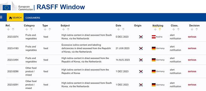 | ▲ EU ‘식품 및 사료 신속경보시스템(RASFF)’에 올라온 한국산 수입 식품 검역 조치 결과. 지난해 12월 독일, 오스트리아 등에서 한국산 말린 해조류에서 요오드 함량이 기준치를 초과했다며 판매 중단 조치했다. |
