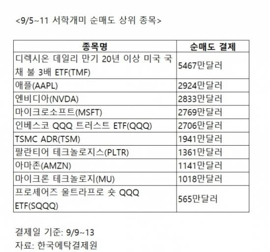 서학개미들이 지난 5~11일 사이에 가장 많이 순매도한 종목은 미국의 장기 국채들로 구성된 지수의 하루 수익률을 3배 따르는 디렉시온 데일리 만기 20년 이상 미국 국채 불 3배 ETF(TMF)였다.