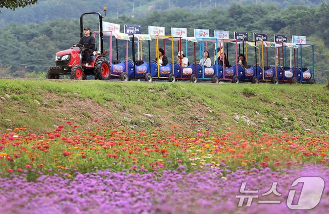 (서울=뉴스1) = 추석연휴인 16일 오후 강원 평창군 평창읍 평강강 둔치에서 열린 2024 평창백일홍축제에서 관광객들이 깡통열차를 타고 꽃놀이를 즐기고 있다.