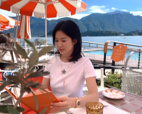 사진 속 송혜교는 맑은 하늘과 넓은 호수를 배경으로 야외 식당에 앉아 있다.