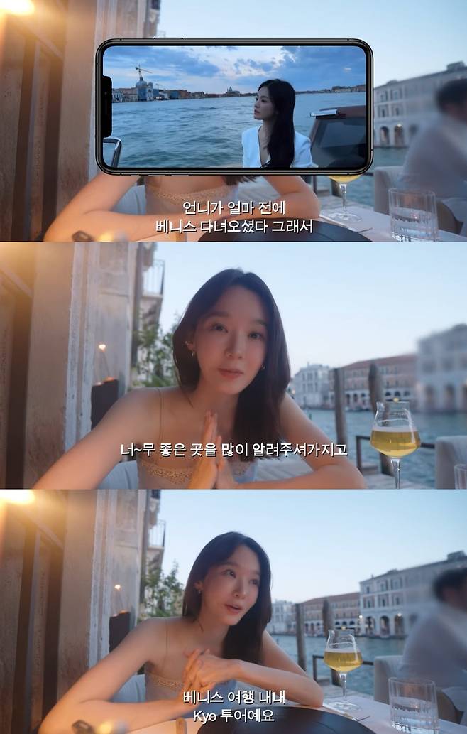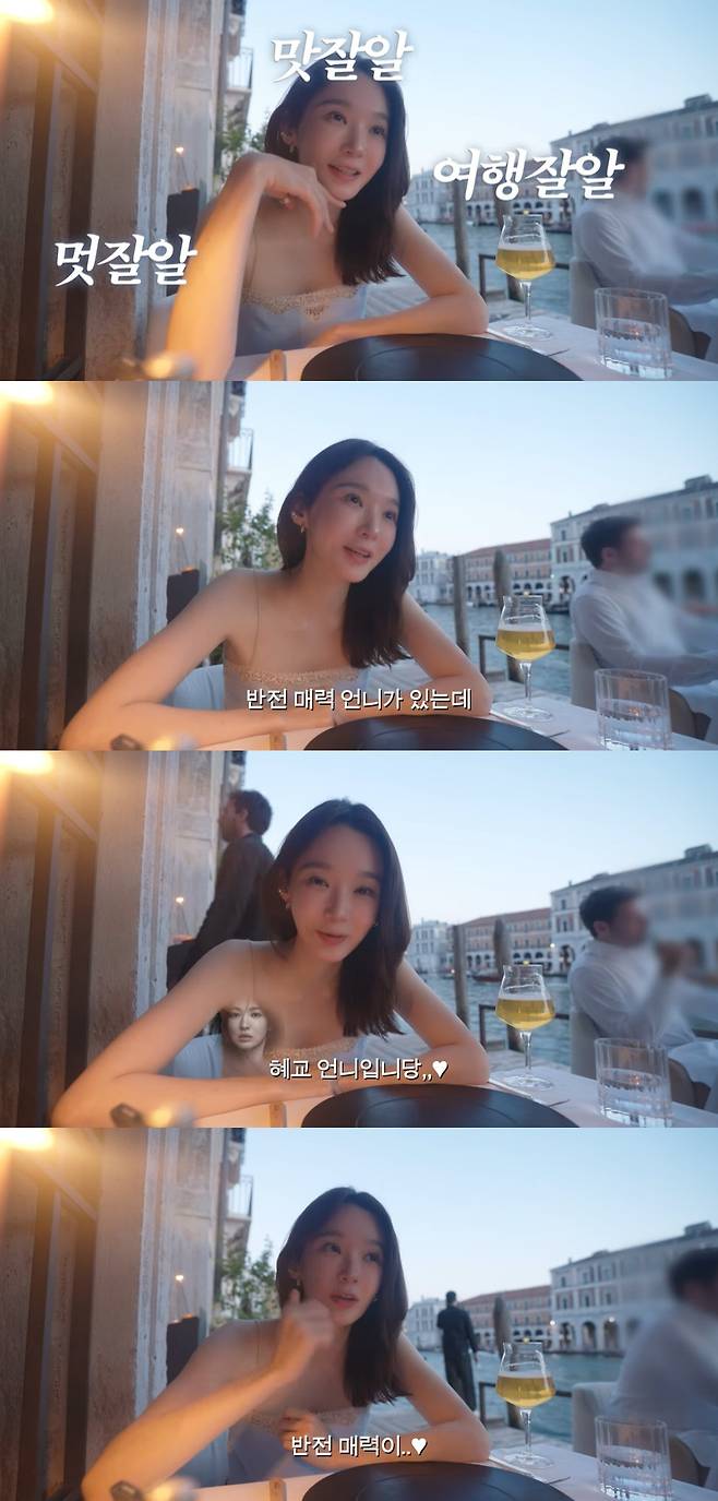 베니스에서는 운하가 잘 보이는 식당 등 다양한 곳을 즐기며 행복을 만끽한 강민경은 "여긴 맛잘알 멋잘알 여행잘알 반전매력 언니가 있다. 그 언니가 추천해주신 곳이다. '태희혜교지현'에 혜교 언니다"라며 송혜교를 언급했다.