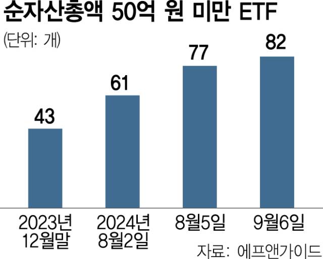 17일 금융 정보 업체 에프앤가이드에 따르면 순자산 총액이 50억 원 미만인 ETF는 8월 2일 61개에서 이달 6일 기준 82개로 한달여 만에 무려 34.4% 증가했다. 대폭락 사태 당일인 지난달 5일 77개보다도 더 불어난 수치다. 한국거래소는 상장된 지 1년이 지난 ETF들 중 반기 말 기준 순자산이 50억 원 미만에 해당되는 경우 관리종목으로 지정한다. 관리종목으로 지정된 후 다음 반기 말까지 이 상태가 지속되면 해당 ETF는 상장폐지된다.