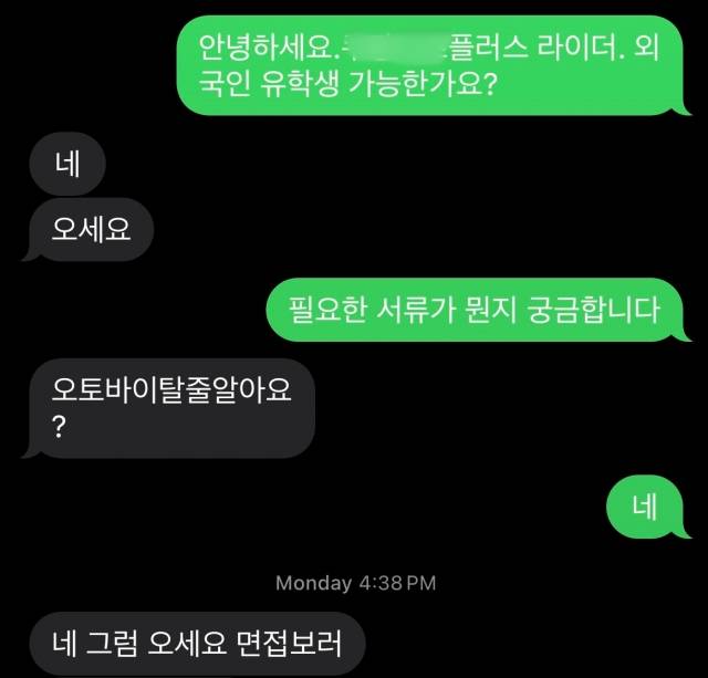 나머지 네 곳에선 ‘유학생도 가능하다’ 등 긍정적인 답변이 돌아왔다. 배달 인력을 구하기가 어려운 상황을 보여주듯 ‘오토바이 탈 수 있느냐’ 등의 조건만 확인하고는 바로 ‘(취업)가능하다’는 답장을 보내온 곳도 있었다.