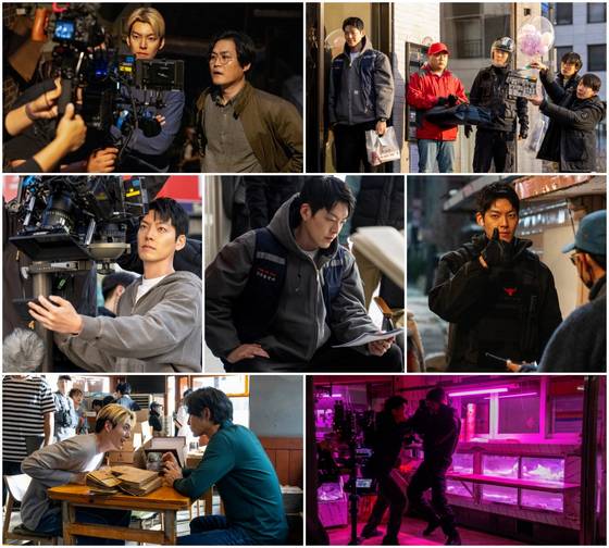 먼저 진지한 표정으로 촬영 장면을 모니터하고, 대본을 꼼꼼히 체크하는 김우빈과 김성균은 작품을 향한 진심을 엿보이게 한다. 극악무도한 범죄자 강기중 역으로 열연을 펼친 이현걸과 김우빈의 액션 비하인드를 담은 스틸에서는 통쾌한 카타르시스를 선사하는 리얼 타격 액션을 완성하기 위한 노력이 돋보인다.