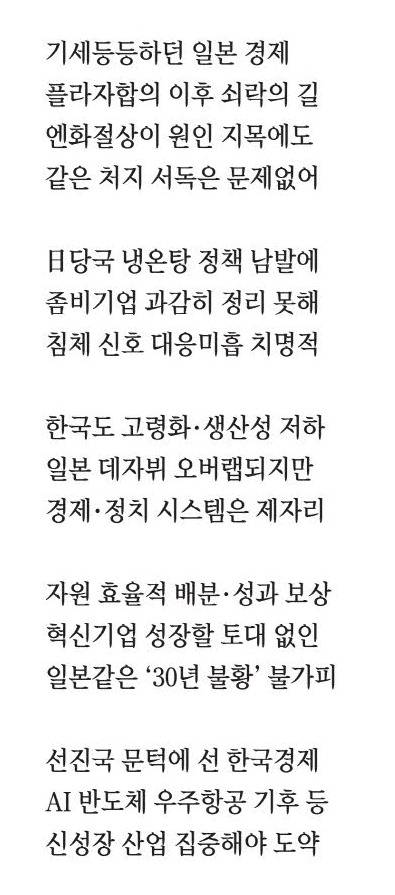 일본이 '잃어버린 30년' 동안 경험한 문제들을 한국도 어느 정도 겪을 것으로 예상하는 사람들이 적지 않다. 그렇기에 한국은 경제와 정치 시스템의 체질 개선이 필요하다. 일본의 실패에서 교훈을 얻어 자원의 효율적 배분, 공정한 경쟁 환경 조성, 혁신적인 기업 지원, 정치적 개혁 등 다양한 분야에서의 변화를 통해 경제와 정치 시스템을 선진화하는 데 주력해야 한다.