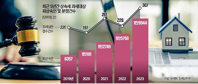 18일 국세청에 따르면 상속세 과세 대상인 피상속인은 △2019년 8357명 △2020년 1만181명 △2021년 1만2749명 △2022년 1만5760명 △2023년 1만9944명 등으로 해마다 늘고 있다. 과세당국의 상속세 부과에 불복해 제기하는 조세심판도 2019년 221건에서 지난해 307건으로 4년간 38.9%(86건) 늘었다. 상속·증여세를 어떻게 줄여야 할지 고민하는 납세자가 많다.