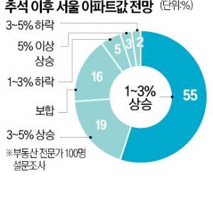 한국경제신문이 지난 9~13일 건설사·시행사·학계·금융권의 부동산 전문가 100명을 대상으로 ‘추석 연휴 이후 부동산시장 전망’을 설문 조사한 결과 이같이 나타났다. 응답자 77명은 ‘연내 서울 아파트값이 상승할 것’이라고 답했다. ‘1~3% 상승’과 ‘3% 이상’ 응답이 각각 55명, 22명이었다. 87명은 서울 전셋값 상승을 예상했다.