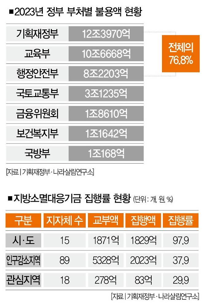 ■ 성적표➊ 불용의 시대 = 올해 2월 정부가 발표한 2023 회계연도 국가결산보고서에 따르면 미집행액 규모만 49조5490억원이었다. 2022년 미집행액(17조9480억원)의 2.8배다.
