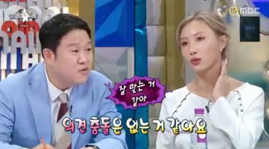 또 김구라는 화사에게 소속사 대표 싸이를 언급하면서 "의견 충돌이 없느냐. 둘이 잘 맞는 것 같다"고 물었고, 화사는 "의견 충돌은 없다. 제가 속으로 생각하는 걸 오빠가 먼저 이야기를 한다. 혹시 충돌있으면 저도 솔직하게 말한다"고 만족했다.