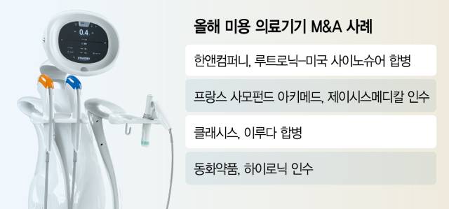 동화약품의 하이로닉 인수는 올들어 네 번째 미용 의료기기 M&A 사례다. 지난해 루트로닉을 인수한 국내 사모펀드(PEF) 한앤컴퍼니는 4월 미국 업체인 사이노슈어와 루트로닉의 합병 계획을 공개했다. 두 회사는 모두 레이저 기반 미용 의료기기를 제조한다. 6월에는 프랑스 PEF 운용사인 아키메드가 제이시스메디칼(287410) 인수, 국내 미용 의료기기 업체인 클래시스(214150)가 또 다른 국내 업체인 이루다(164060)를 합병한다고 발표했다.