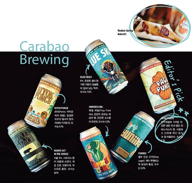 수제 맥주를 언급하기 이전에 우선 안주부터 소개해야겠다. 다양한 핑거푸드가 있는데 그중 시그니처는 수제 파스트라미(Pastrami)를 다져 넣은 '루벤 스프링 롤(Reuben Spring Rolls)'이다. 마요네즈를 베이스로 파프리카, 핫소스, 케첩, 피클 등을 섞은 사우전드 아일랜드 소스가 함께 제공된다. 짭짤하게 입 안을 가득 메우는 파스트라미의 감칠맛이 자연스레 맥주를 부른다. 튀긴 안주가 싫다면 파스트라미를 이용한 루벤 샌드위치도 있으니 선택은 자유다. 카라바오 브루잉은 시즌마다 조금씩 다른 수제 맥주 리스트를 선보인다. 라거, 에일, IPA 등 가지각색의 맥주를 맛보고 싶다면 '브루어리 샘플러'가 그 해답이다.