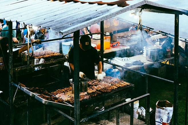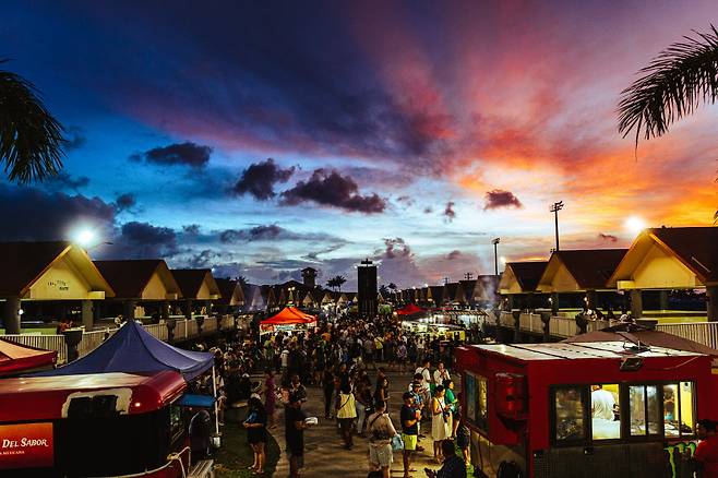 매주 수요일 저녁이면 하갓냐 파세오 공원(Paseo de Susana) 일대가 뿌옇다. 차모로 빌리지 야시장에서 쉴새 없이 구워대는 바비큐 연기 때문이다. 너른 공간에 각기 다른 테마의 부스 50여 개가 줄지어 서 있는데 닭고기, 돼지고기, 소고기, 양고기 등 각종 바비큐부터 차모로 전통 음식, 생과일주스 등 그야말로 먹거리가 지천에 널려 있다. 바비큐 굽는 냄새가 허기를 자극해 속이 쓰릴 지경이다. 굽는 중간중간 고기가 마르는 것을 방지하기 위해 바비큐 소스와 간장 베이스 양념을 바르는데, 이때 숯에 닿는 그 육즙과 소스들이 만드는 연기가, 그야말로 치명적인 매혹이다.