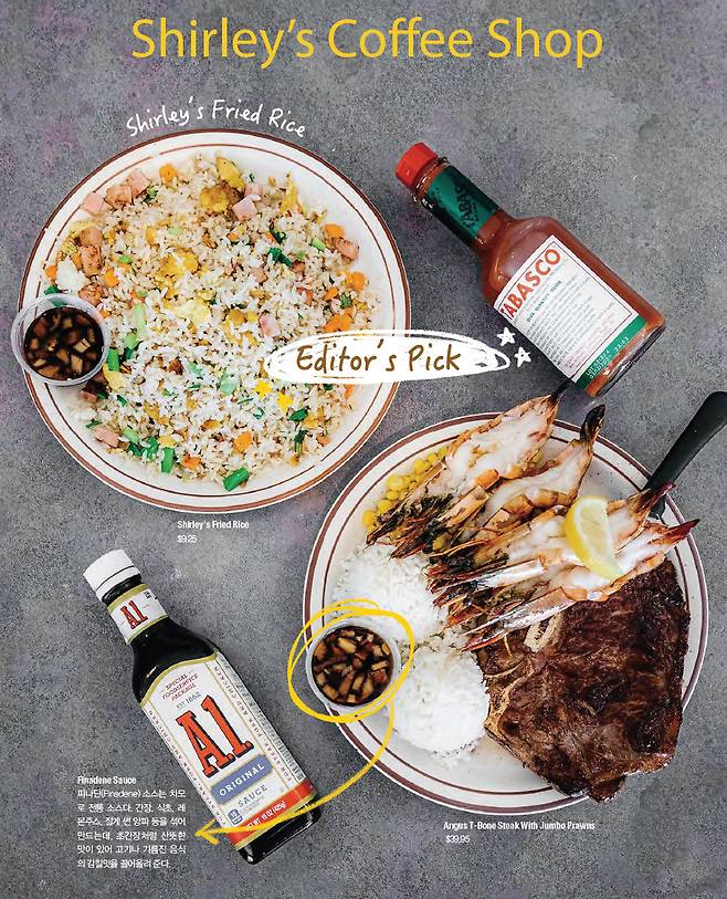 볶음밥 옆에는 차모로 전통 소스인 '피나딘 소스(Finadene Sauce)'가 곁들여 나온다. 소스에 들어가 있는 자잘한 양파가 아삭하고 씹힐 때 터져 나오는 달큰함이 매력적이다. 이외에도 스테이크, 새우구이 등 선택지가 다양하다. 스테이크는 A1 소스와 타바스코를 반반 섞어 찍어 먹어야 제맛이다. 셜리스 '커피 숍'이란 이름답게 브런치, 디저트 메뉴도 가득하다. 커피는 시원 깔끔한 블랙커피인데 숟가락이 담겨 나오는 게 시그니처다. 테이블에 있는 설탕을 커피에 넉넉히 뿌려 휘휘 저어 먹으면 된다.