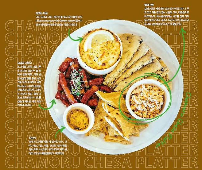 그리하여 괌은 독자적인 맛을 가졌다. 이것이 본론이다. 앞서 나열한 괌의 역사는 이 중요한 순간을 위한 발판이었을 뿐. 차모로의 식문화는 필리핀, 스페인, 미국, 일본 등 괌을 오고 가던 각국의 맛을 흡수했다. 사방이 바다인 괌은 예로부터 해산물이 풍부했다. 문제는 해산물만 풍부했다는 것이다. 그래서 과거 차모로족은 단백질을 주로 해산물이나, 거북이, 새 등으로 섭취할 수밖에 없었다. 17세기 초, 스페인의 식민지배가 시작되며 소, 돼지, 닭, 사슴 등을 괌에 들였다. 더운 나라에서 육류를 기반으로 한 요리가 많아지니 자연스레 각종 향신료를 사용한 염장 기술이 괌으로 유입됐다. 이후 2차 세계대전 시기에는 일식의 조리 기법과 전쟁 필수품인 통조림이 괌에 유입됐고, 미군이 괌에 들어오며 차츰 본토와 맛이 평준화되기에 이른다. 괌의 격동적인 역사는 차모로 식문화의 좋은 양분이 되었다. 그래서 괌의 맛은 오로지 괌에서만 맛볼 수 있다.