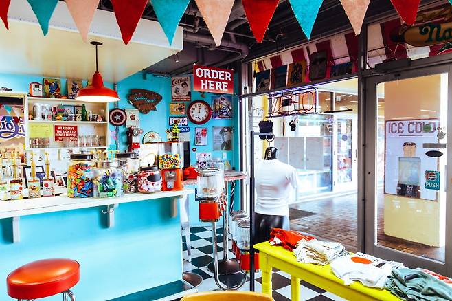 '피즈 앤 코'는 1950년대 미국에서 유행하던 소다 전문점을 표방한다. 형광 톤의 하늘색 벽지에 덕지덕지 붙어 있는 빈티지 포스터. 아기자기하게 전시된 미니어처와 빨간색 체크무늬 테이블 보, 오픈식 주방 뒤로 보이는 각종 소다 시럽까지, 그 시대의 분위기를 완벽히 재현해 냈다. 놀랍게도 이곳은 2014년에 오픈해 올해로 10년째니, 이쯤 되면 단순히 분위기를 흉내 내는 곳이라고 할 순 없겠다.