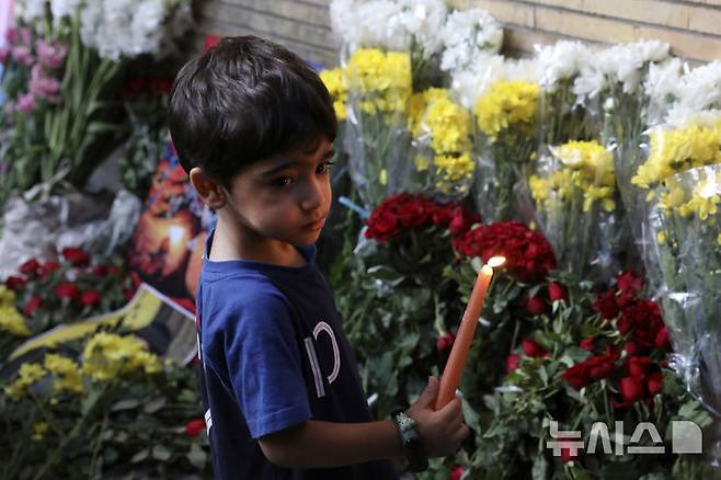 [테헤란=AP/뉴시스] 18일(현지시각) 이란 테헤란의 레바논 대사관에 마련된 무선호출기(삐삐) 폭발 희생자 추모소 앞에서 한 소년이 촛불을 들고 있다. 지난 17일 레바논 전역에서 호출기 수천 대가 동시다발적으로 터지면서 12명이 숨지고 2800여 명이 다쳤고 18일에는 헤즈볼라가 사용하던 무전기가 터져 최소 3명이 숨졌다. 2024.09.19.