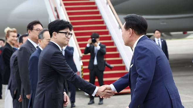 ▲ 윤석열 대통령이 19일 성남 서울공항에서 체코 공식 방문을 위해 출국하며 환송나온 국민의힘 한동훈 대표와 악수하고 있다.