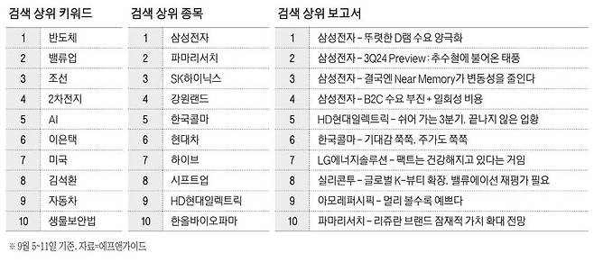 한 주간 투자자들의 이목이 쏠렸던 종목은 삼성전자, 파마리서치, SK하이닉스, 강원랜드 등으로 나타났다. 키워드 검색 순위에서는 반도체가 가장 높은 순위를 지켰고, 2위는 밸류업, 3위는 초호황기에 들어갔다는 조선이 차지했다. 보고서 순위에서는 최근 긴 부진 끝에 반등한 삼성전자 관련 보고서가 1위부터 4위까지를 모두 독식했다.