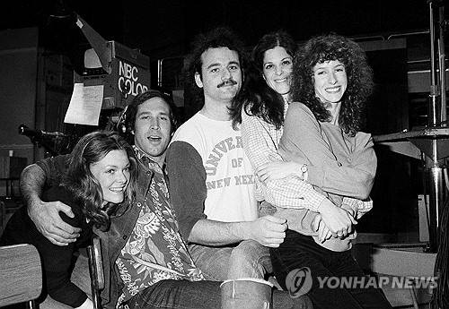FILE - Comedian Chevy Chase, second from left, joins the cast of NBC's "Saturday Night Live," with Laraine Newman, from right, Gilda Radner, Bill Murray and Jane Curtain, left, on Feb. 16, 1978 in New York. (AP Photo/Marty Lederhandler, File) 14601. FEB. 16, 1978 FILE PHOTO.