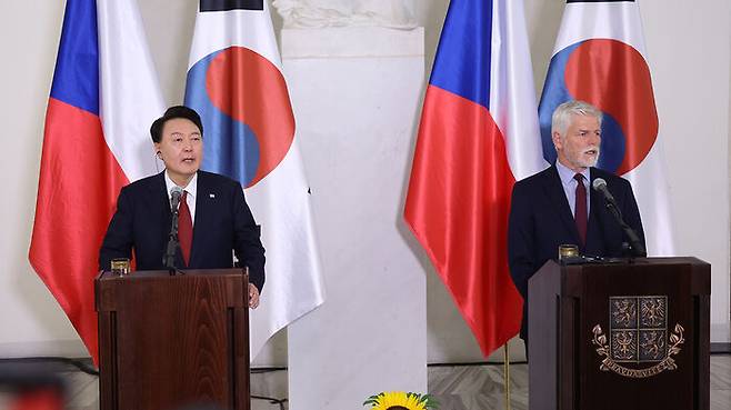 ▲ 한·체코 정상 공동기자회견을 하고 있는 윤석열 대통령과 페트르 파벨 체코 대통령